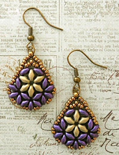 After teasing you by blogging for several days about my "Bethany" adaptation of Beth Clark's "Beth Duo Earrings" pattern, I'm very happy to tell you that Beth has given me the okay to post my version as a free pattern. I should warn you though that there are no diagrams in the tutorial, only the instructions. That's because I had originally typed it up for my own use and I didn't need illustrations. If I have a chance sometime, I might add some illustrations to the tutorial and will update the file at that time, if I do.