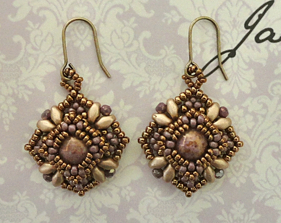 Because the crystals that I used are smaller than what the pattern calls for, my earrings aren't as square as Sabrina's. I assume that "Quadretto" means "square" in Italian but I think that my earrings are just as pretty even if they're not really square. As I did with the Toho sample, I wove back around the perimeter and popped out the center point beads on my final pair of earrings to tidy things up. Had I not done that, the corners would have been too rounded.