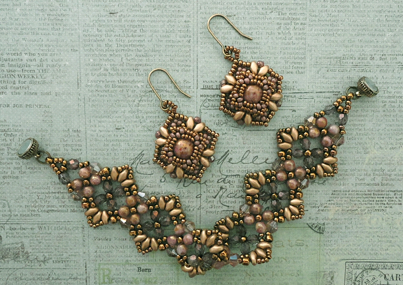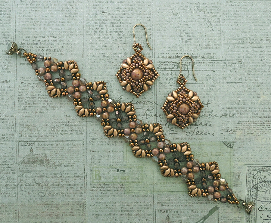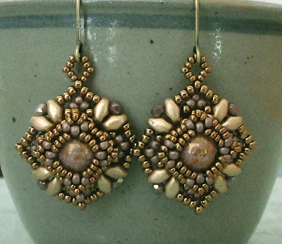 I was hoping to be able to use the same color Toho seed beads that I had used to make the bracelet but the results weren't very good. According to the materials list in the pattern, Sabrina had used Miyuki seed beads. So I tried using the closest Miyuki color for my next sample and that was "Light Bronze" (457L). With Miyuki beads, I got a neater, more compact earring sample than I did with the Toho beads. Sample #1 below was made with Toho beads and the points stick out much too far. Plus, they were a big mess before I went back around and popped out the center point beads. I did use Toho seed beads for the accent color in all of the earrings but only because I liked the color and didn't have a similar Miyuki color.